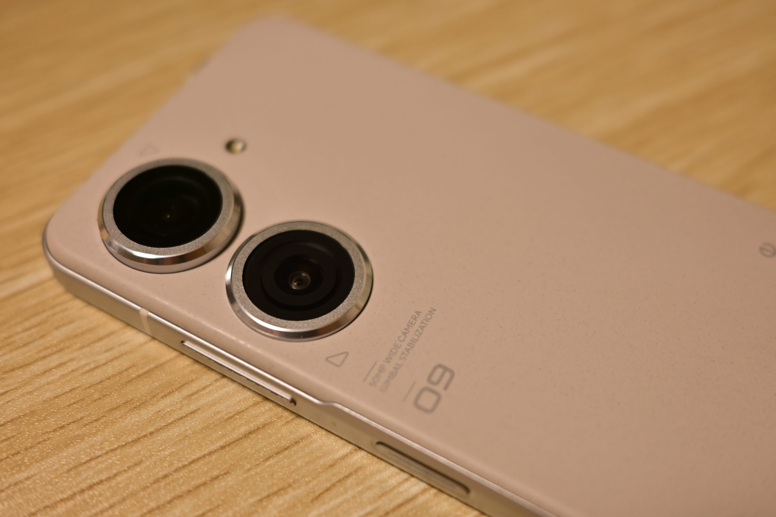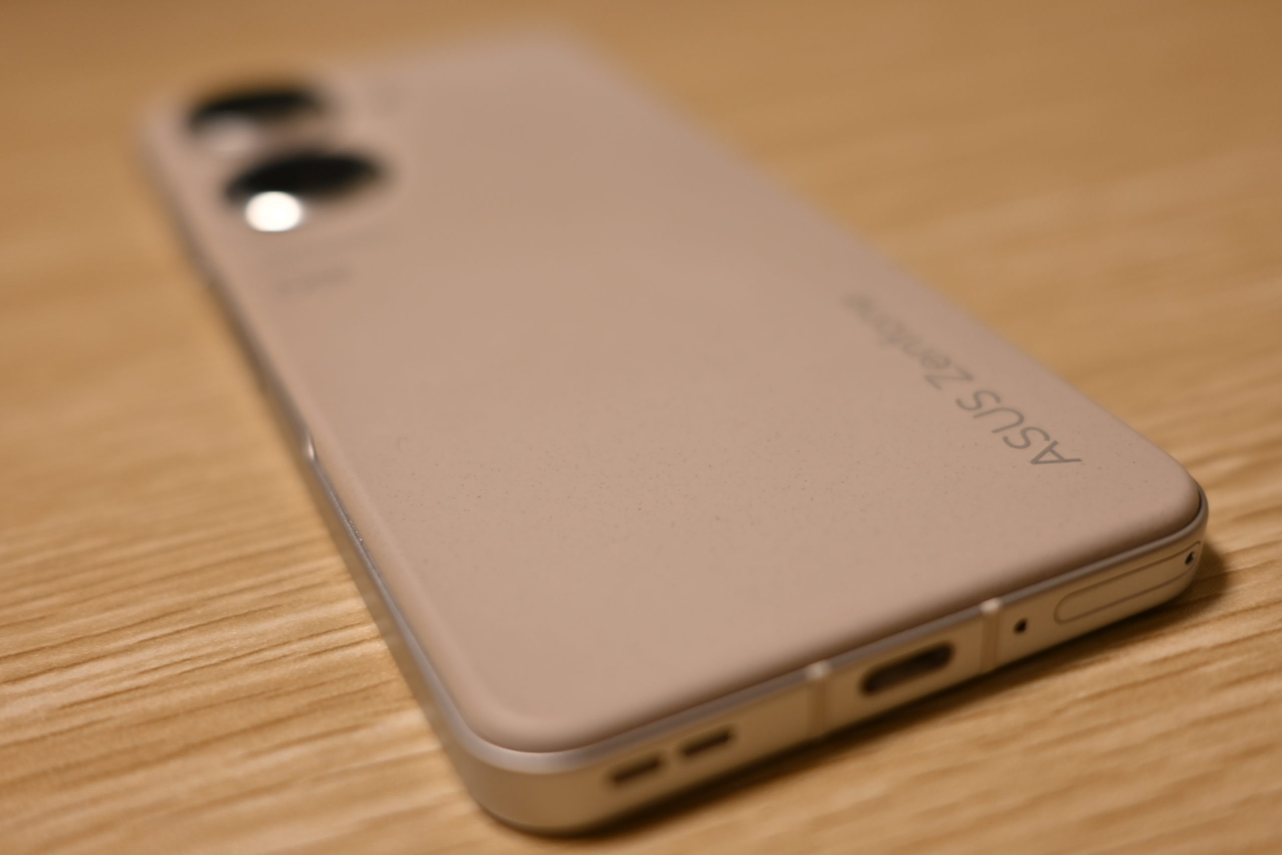 Zenfone 9の背面は特殊だ。通常、スマホの背面はガラス素材でできているけれど、Zenfone 9の背面はザラザラのマット素材になっている。画像では質感を伝えられないのが残念である。